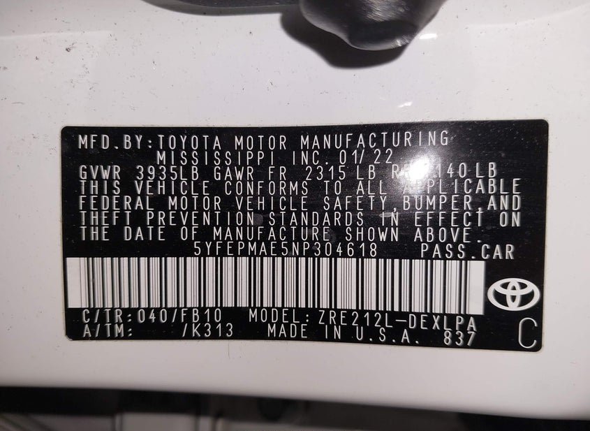 - VIN: 5YFEPMAE5NP304618