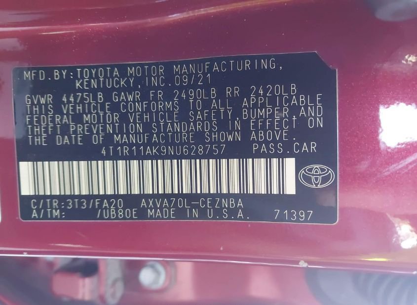 - VIN: 4T1R11AK9NU628757
