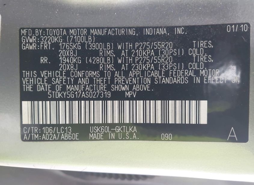 - VIN: 5TDKY5G17AS027319