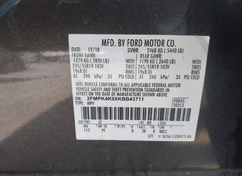 - VIN: 2FMPK4K9XKBB43711