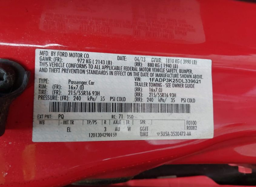 - VIN: 1FADP3K25DL339621