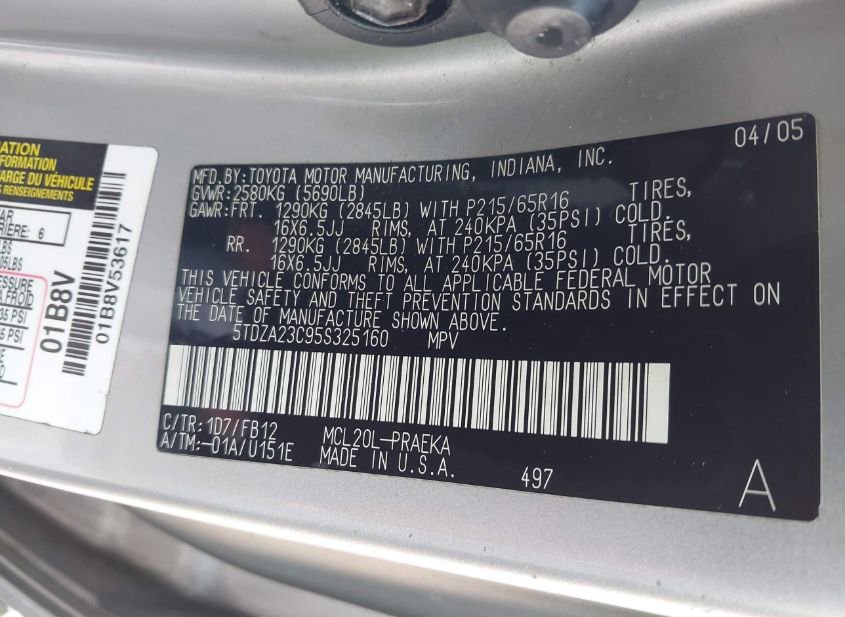 - Название лота: 2005 TOYOTA SIENNA LE
