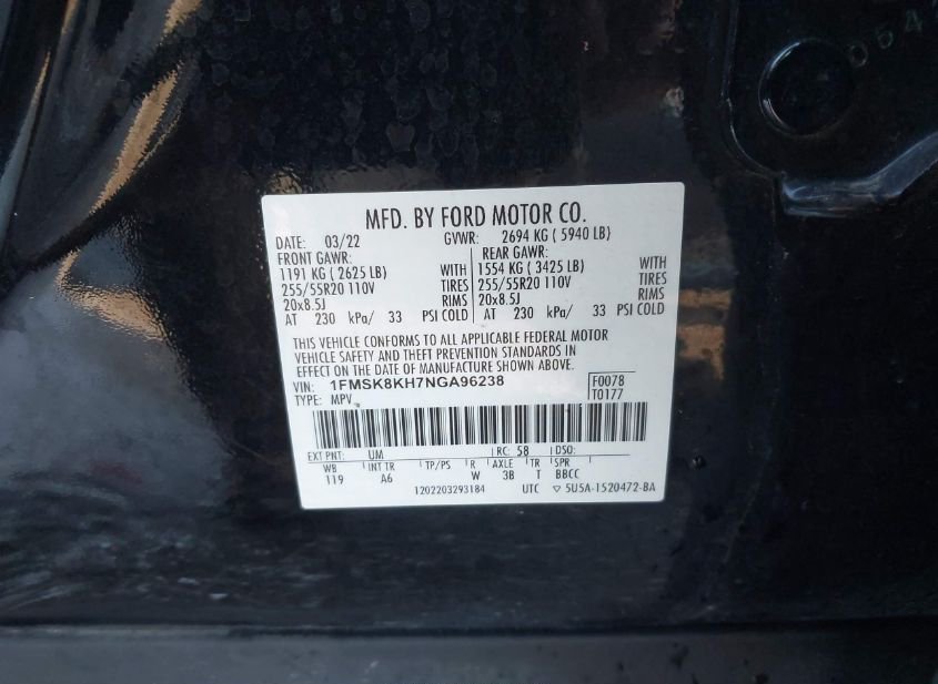 - VIN: 1FMSK8KH7NGA96238