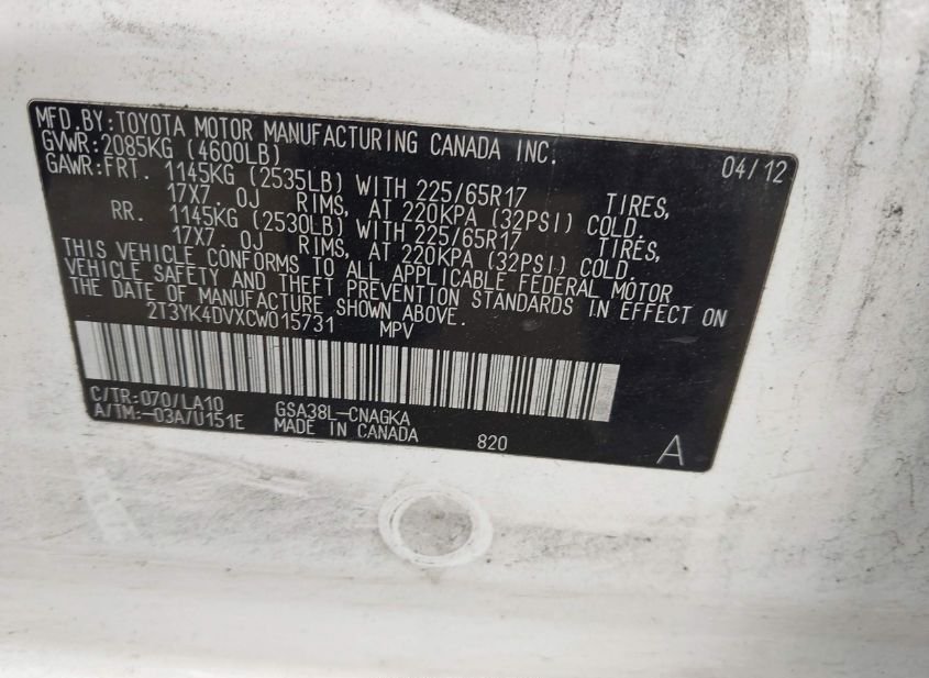- VIN: 2T3YK4DVXCW015731