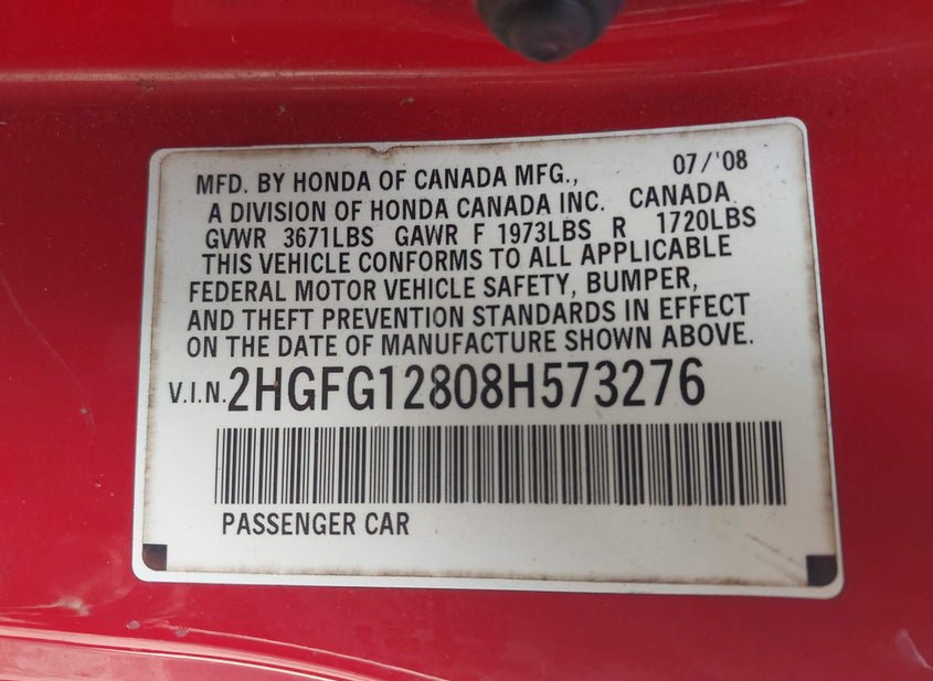 - VIN: 2HGFG12808H573276
