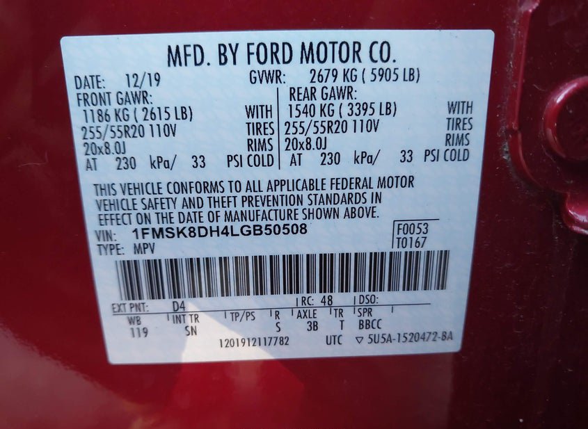 - VIN: 1FMSK8DH4LGB50508