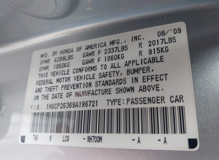 - VIN: 1HGCP26369A196721