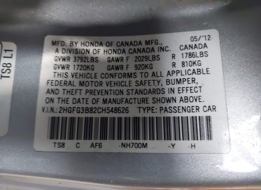 - VIN: 2HGFG3B82CH548626