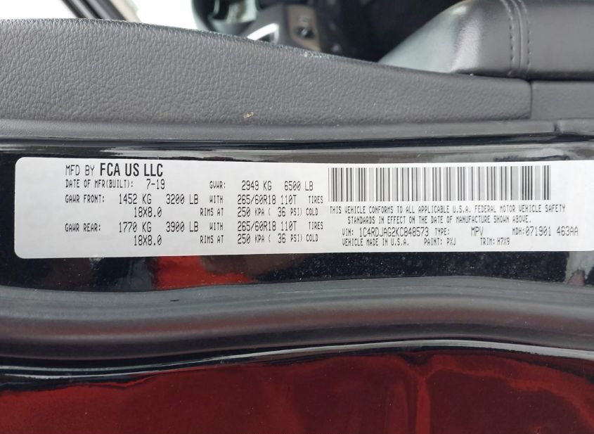 - VIN: 1C4RDJAG2KC848573