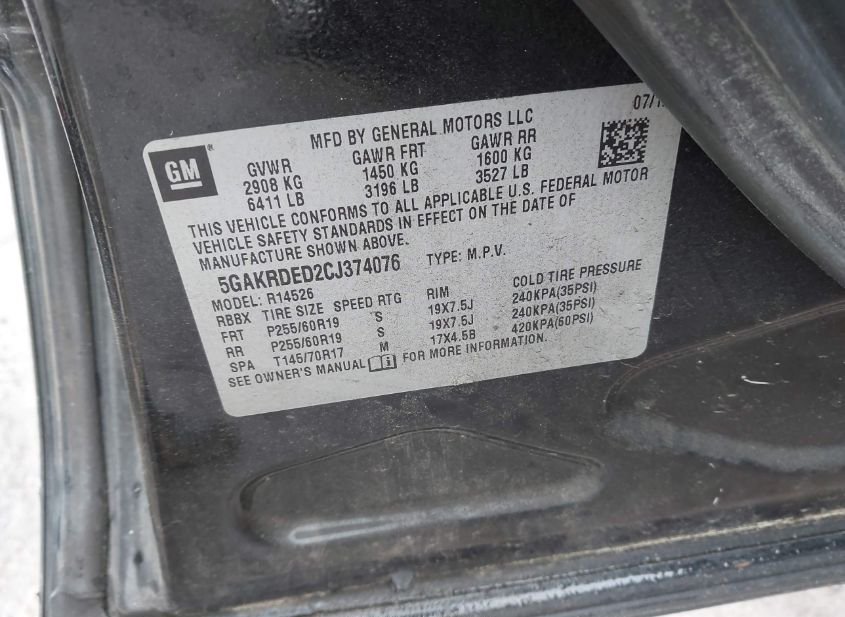 - VIN: 5GAKRDED2CJ374076
