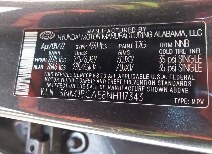 - VIN: 5NMJBCAE8NH117343