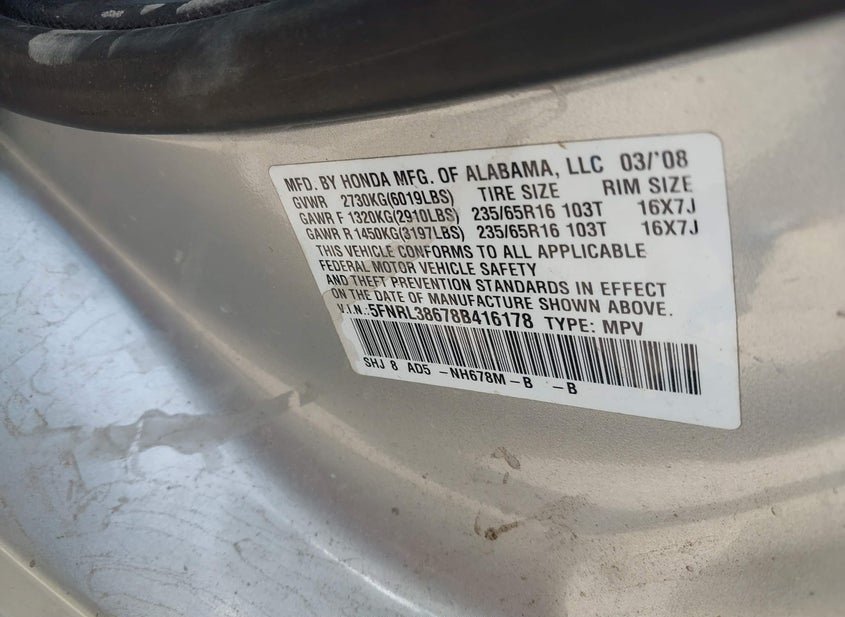 - VIN: 5FNRL38678B416178