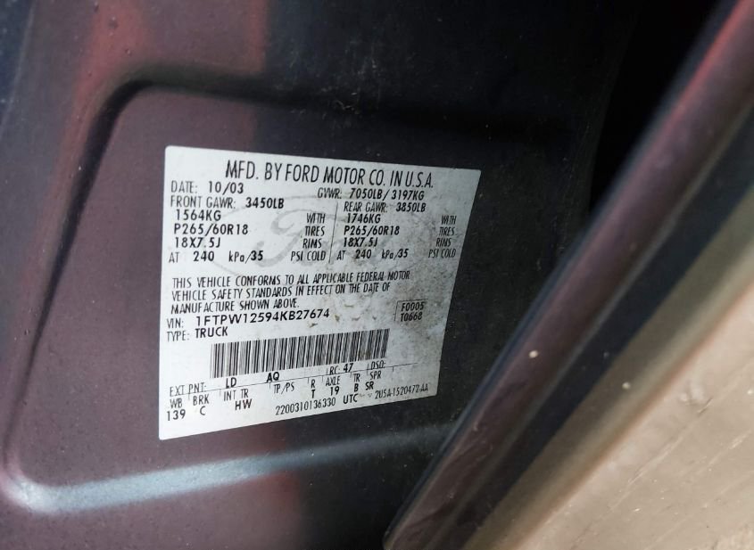 - VIN: 1FTPW12594KB27674