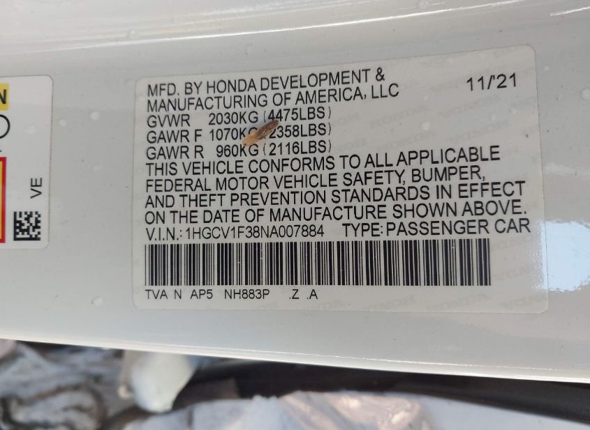 - VIN: 1HGCV1F38NA007884