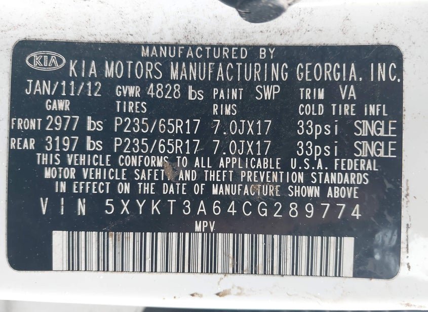 - VIN: 5XYKT3A64CG289774