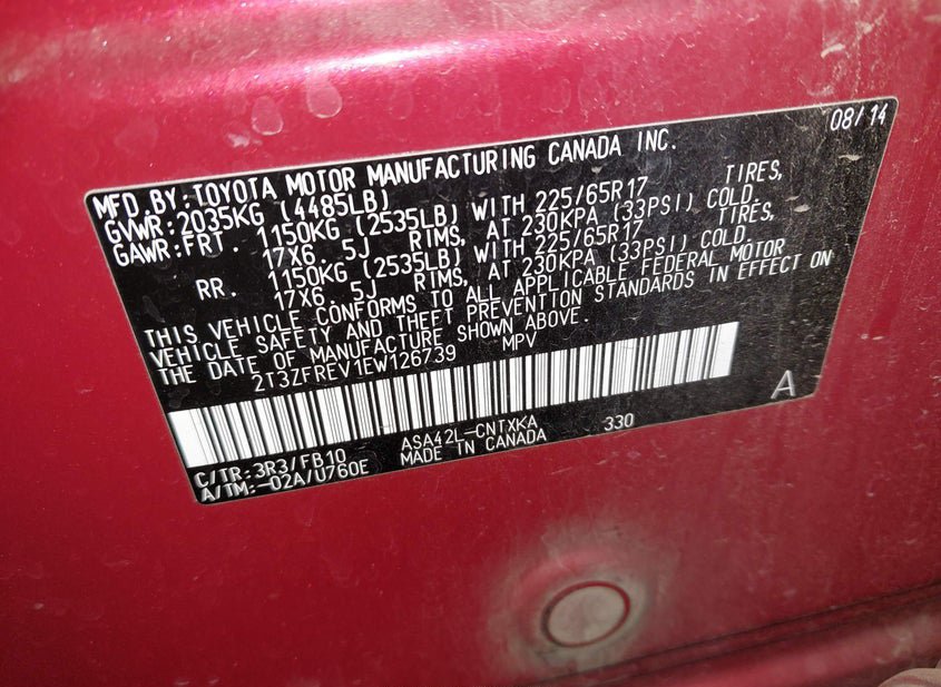 - VIN: 2T3ZFREV1EW126739