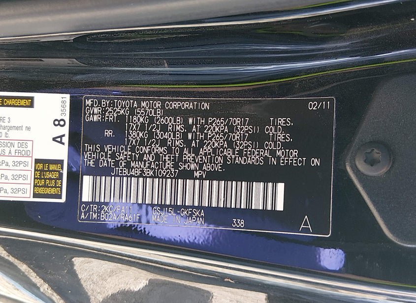 - VIN: JTEBU4BF3BK109237