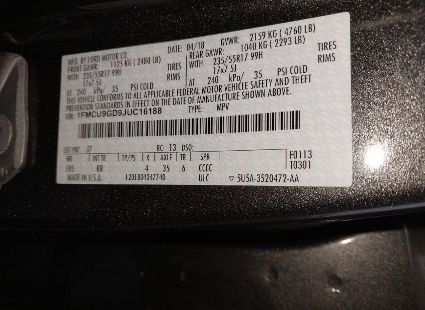 - VIN: 1FMCU9GD9JUC16188