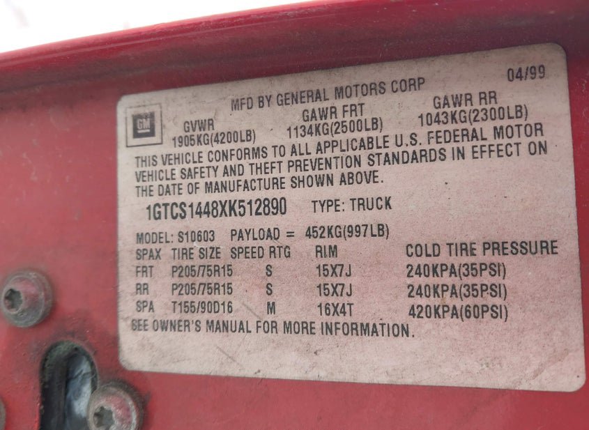 - VIN: 1GTCS1448XK512890