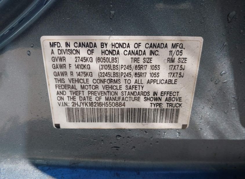 - Название лота: 2006 HONDA RIDGELINE RT