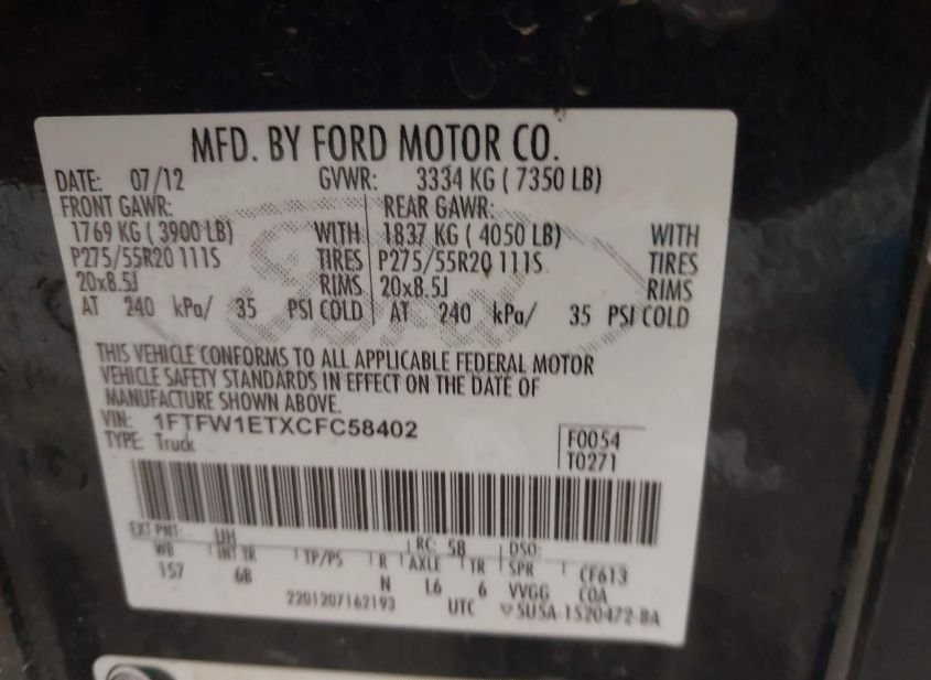 - VIN: 1FTFW1ETXCFC58402