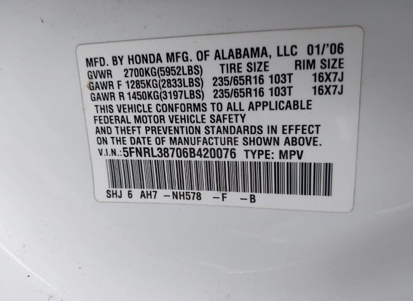 - VIN: 5FNRL38706B420076