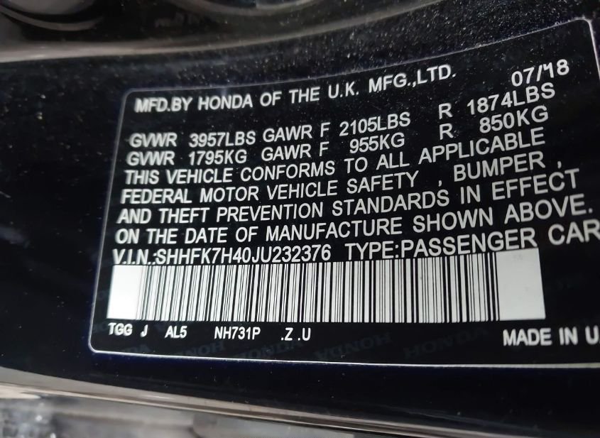 - VIN: SHHFK7H40JU232376