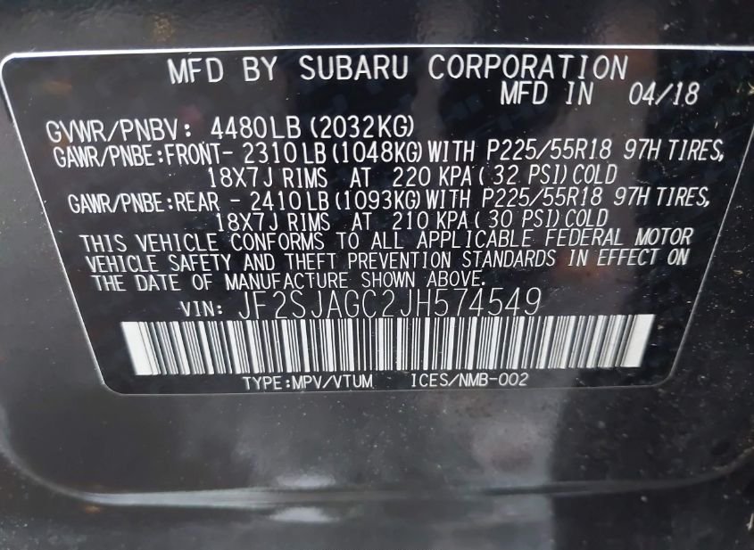 - VIN: JF2SJAGC2JH574549