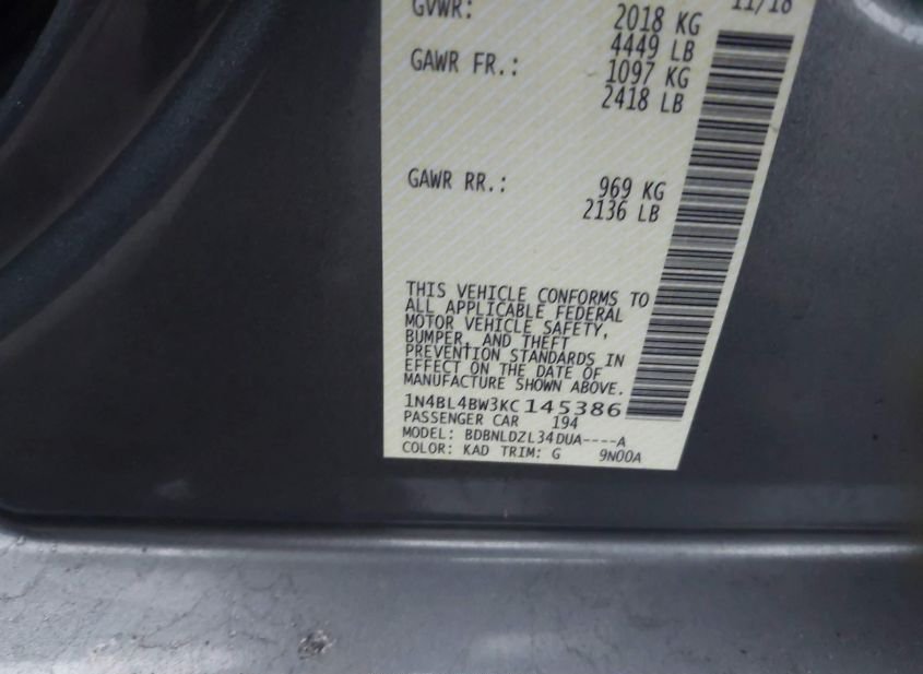 - VIN: 1N4BL4BW3KC145386