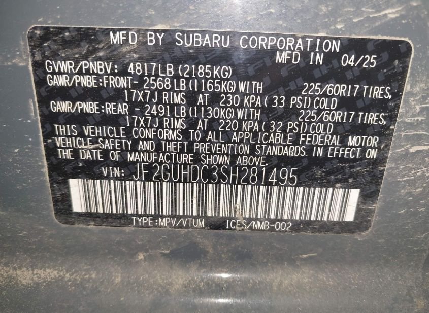 - VIN: JF2GUHDC3SH281495