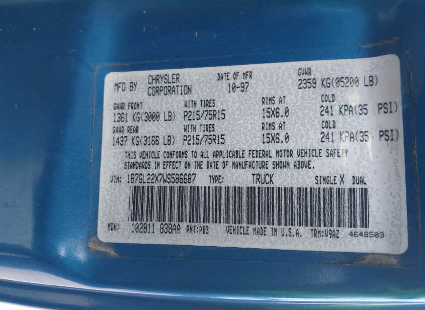 - VIN: 1B7GL22X7WS586687