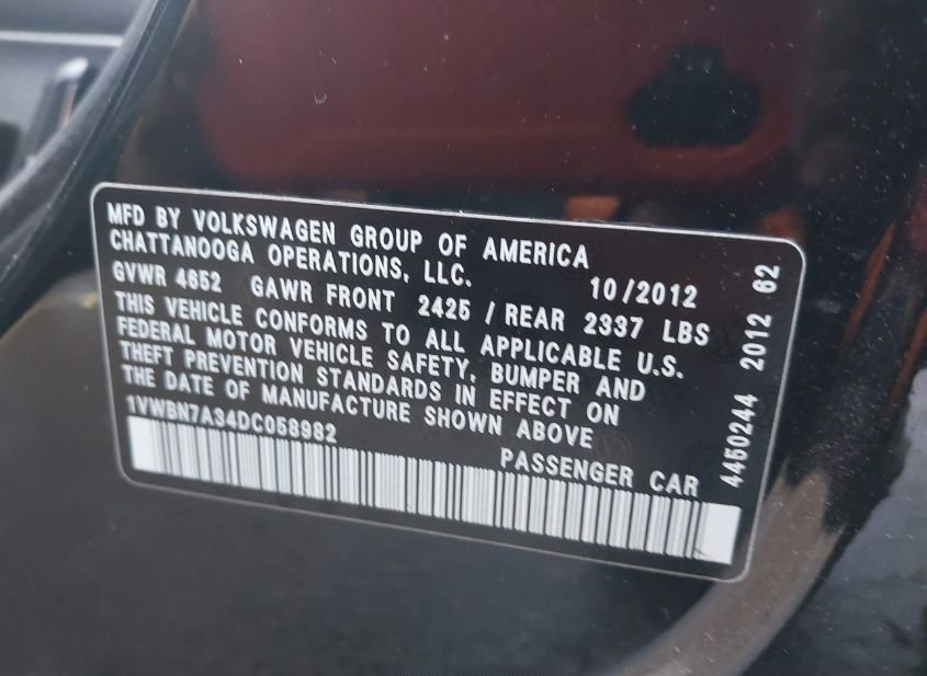 - VIN: 1VWBN7A34DC058982
