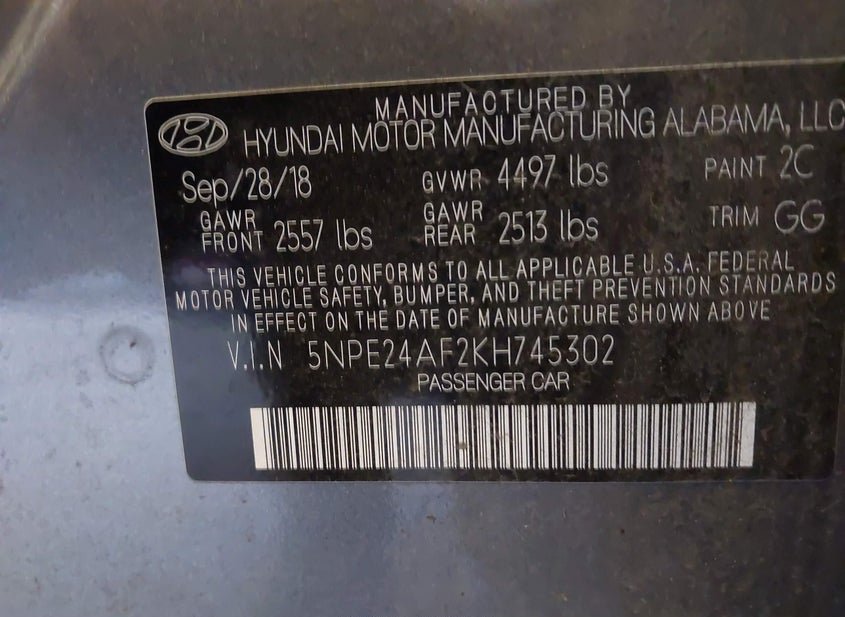 - VIN: 5NPE24AF2KH745302