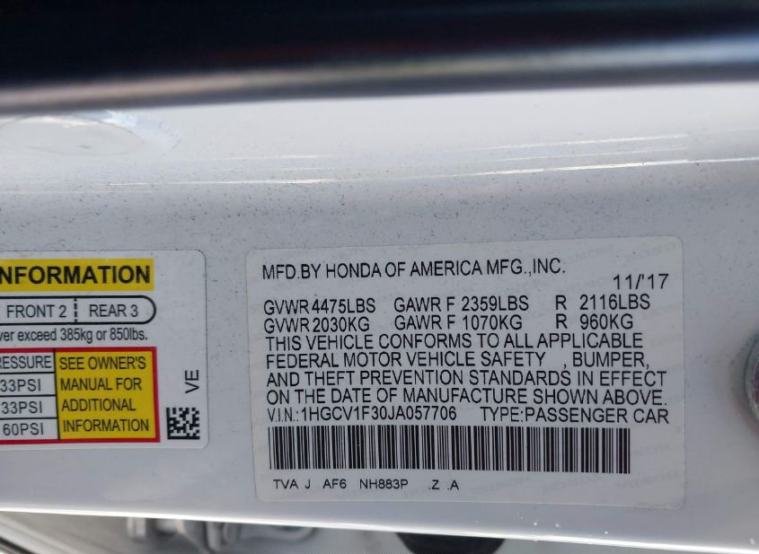 - VIN: 1HGCV1F30JA057706