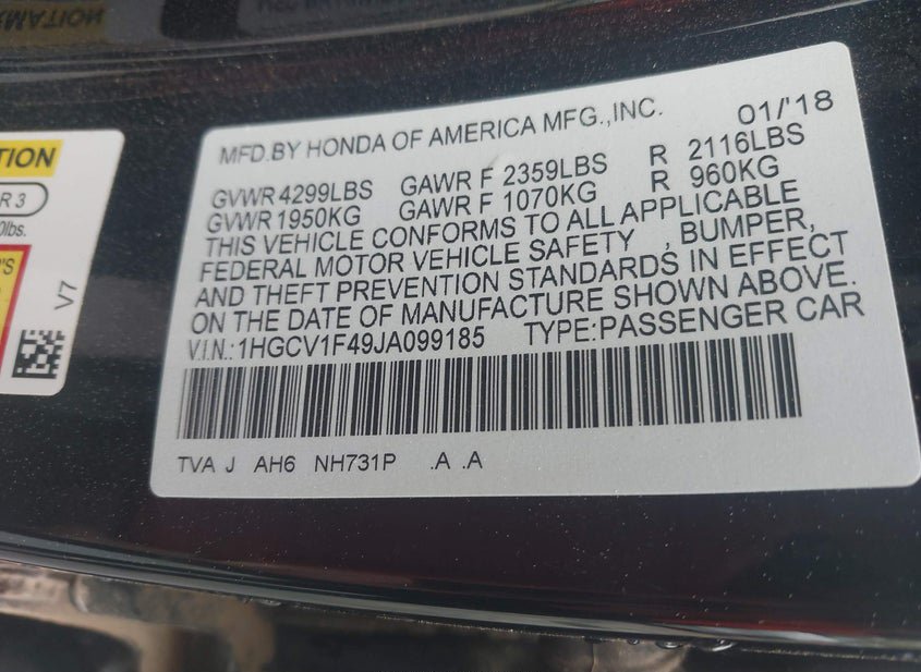 - VIN: 1HGCV1F49JA099185
