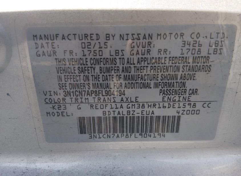 - VIN: 3N1CN7AP8FL904194