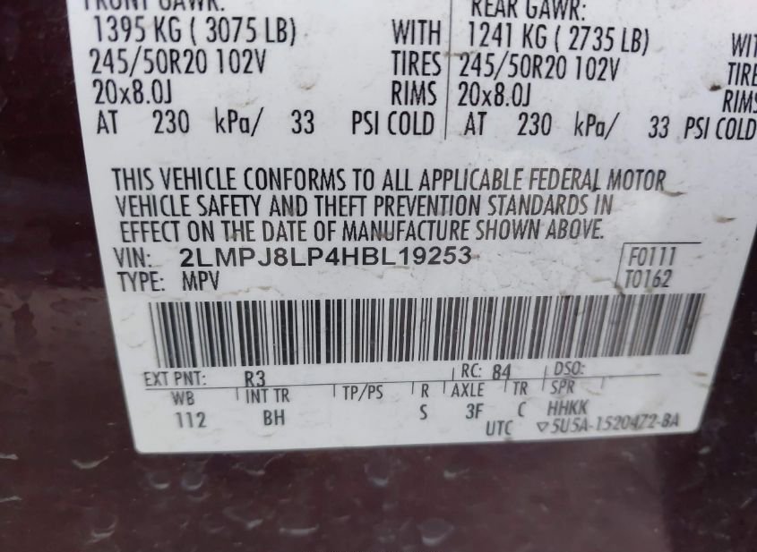 - VIN: 2LMPJ8LP4HBL19253