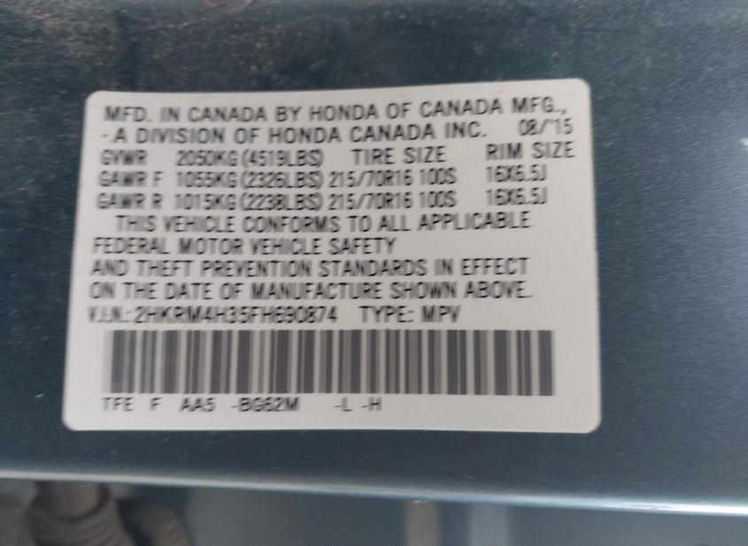 - VIN: 2HKRM4H35FH690874