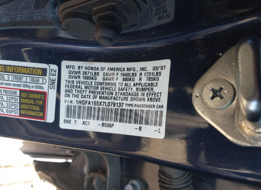 - VIN: 1HGFA165X7L079137
