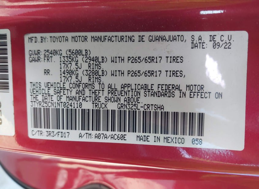 - VIN: 3TYRZ5CN1NT024110