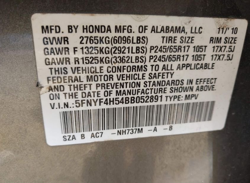 - VIN: 5FNYF4H54BB052891