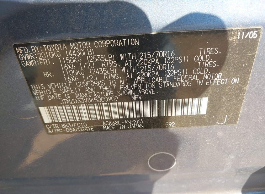 - VIN: JTMZD33V865000909