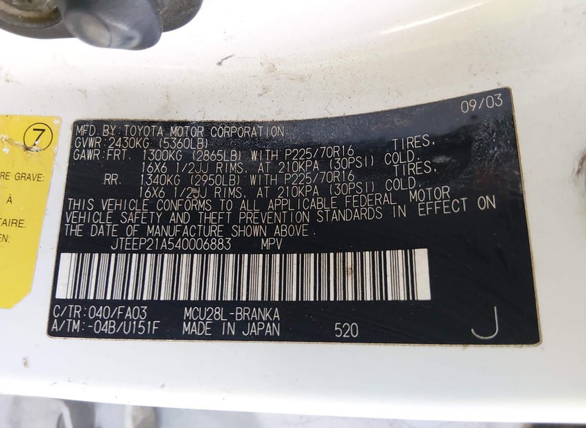 - VIN: JTEEP21A540006883