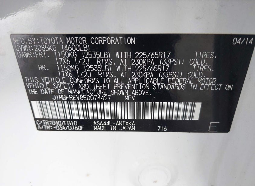 - VIN: JTMBFREV8ED074427