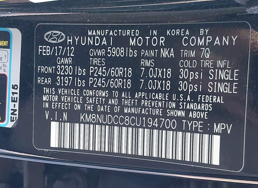 - VIN: KM8NUDCC8CU194700