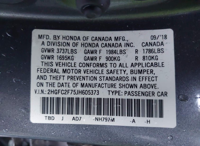 - VIN: 2HGFC2F75JH605373