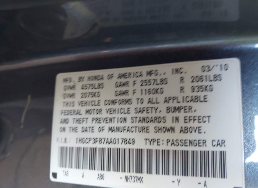 - VIN: 1HGCP3F87AA017849
