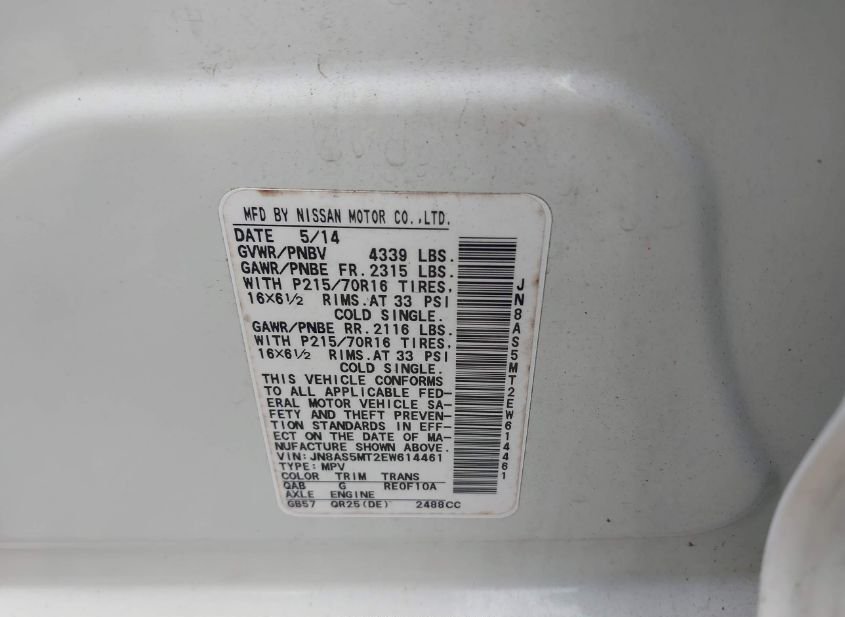 - VIN: JN8AS5MT2EW614461