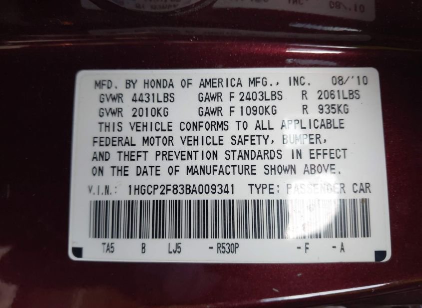 - VIN: 1HGCP2F83BA009341