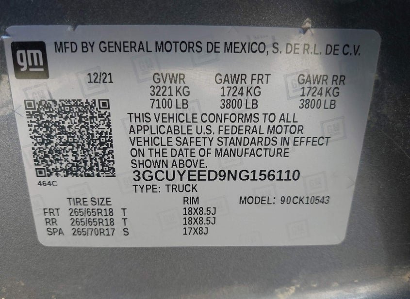 - VIN: 3GCUYEED9NG156110